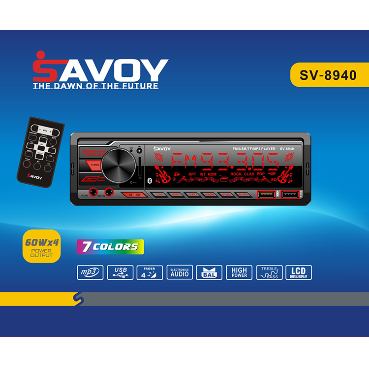 دکلس پنل ثابت ساووی SV-8940 دارای قابلیت ها و ویژگی های خوب و کار آمدی می باشد که شامل ، بلوتوث ، ورودی USB ، رادیو ، ورودی AUX و ورودی شارژ موبایل می باشد.